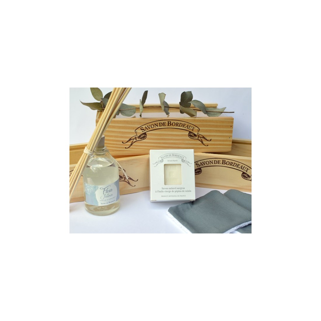 Découvrir le produit Coffrets & cadeaux FLEURS Coffret-Prestige-fleurs 26,50 € Le coffret « Fleurs » Savon de Bordeaux® est composé de 3 Savons naturels Prestige : Fleur du Pyla (mimosa), Fleur de Jasmin et Rose Sauvage la catégorie premium de notre collection. Le coffret est fermé par une glissière en plexiglass. Notre caisse en bois sur-mesure, estampillée Savon de Bordeaux®, est fabriquée par la caisserie bordelaise, basée à... Ajouter au panier