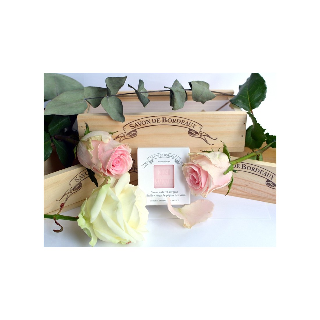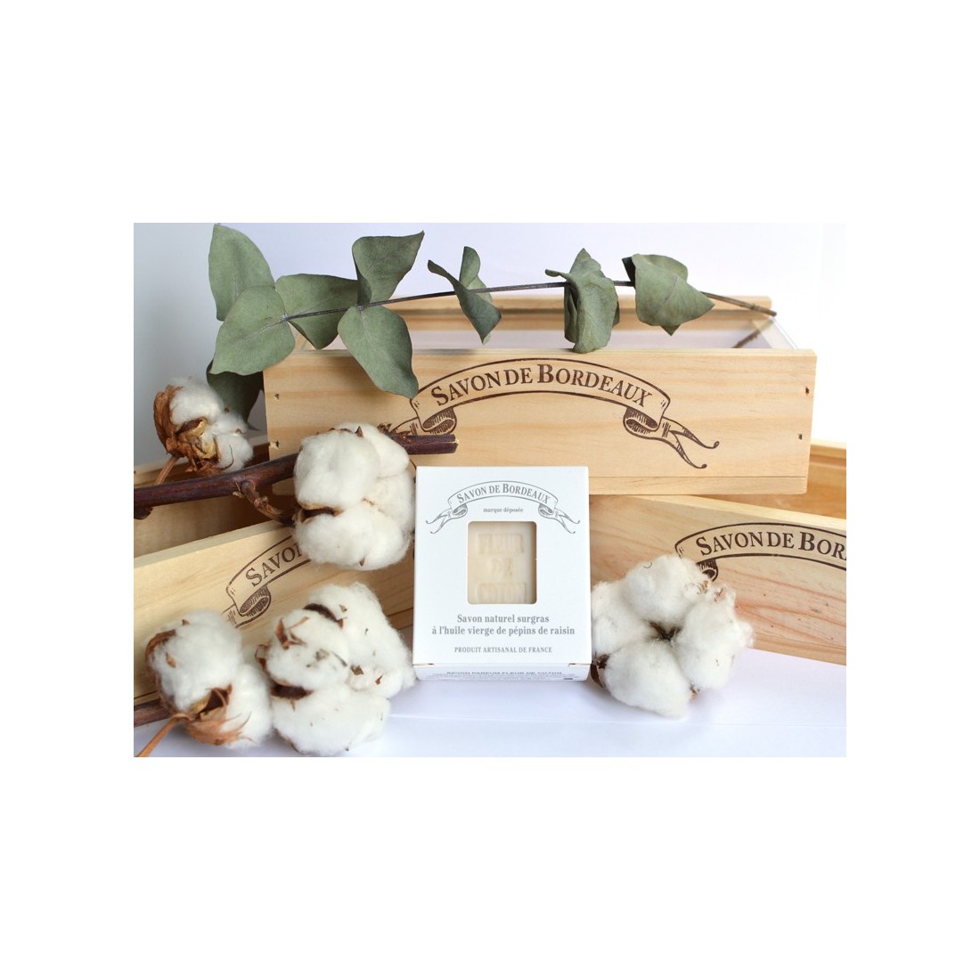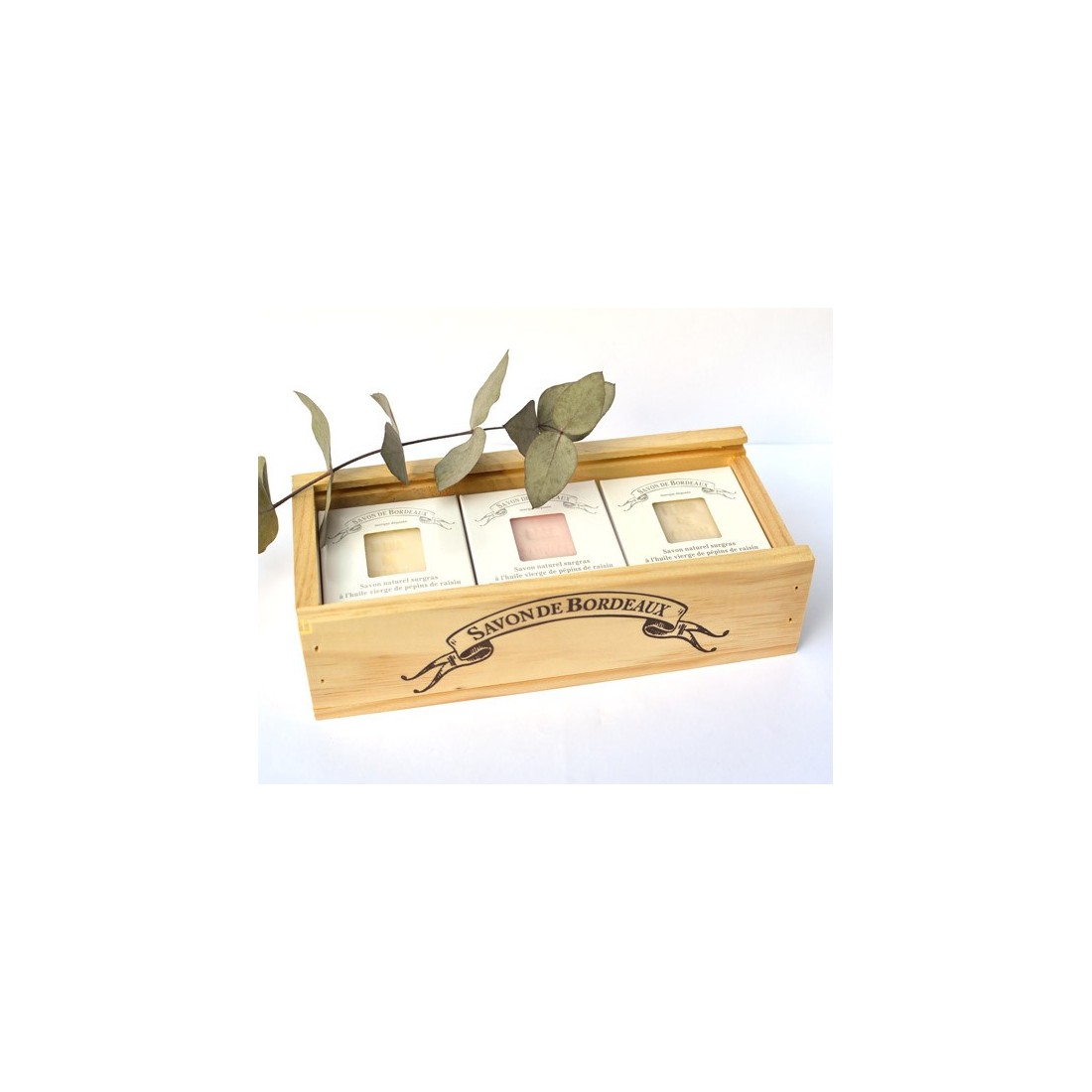 Notre caisse en bois sur-mesure, estampillée Savon de Bordeaux®, est fabriquée par la caisserie bordelaise, basée à Libourne (33).
